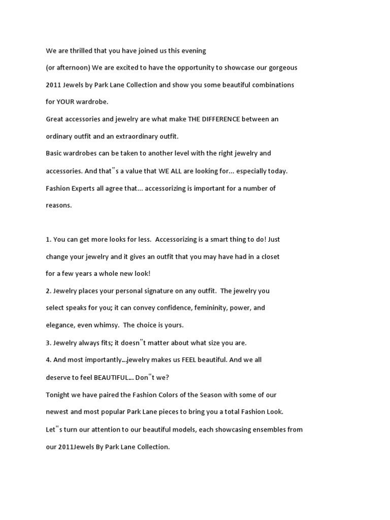 It was very eclectic and I love the way she combines colours and makes them flamboyant. E is 14 and a freshman at Mount de Sales Academy for Girls. How to write a fashion show script. Jump to Page. The first fashion show I ever attended was for Ritu Beri in 1997 or 1998. I personally think an informal anchoring script is best because you are open to trying more things with the audience. Good Morning Ladies and Gentleman. Writing and preparing a perfect anchoring script depends on the type of event type and age of your audience overall showevent setup and organizers expectations. The narration tells the audience the 4-Hers name information about the garment special features of the garment and other information that can help the audience identify with the model or garment.