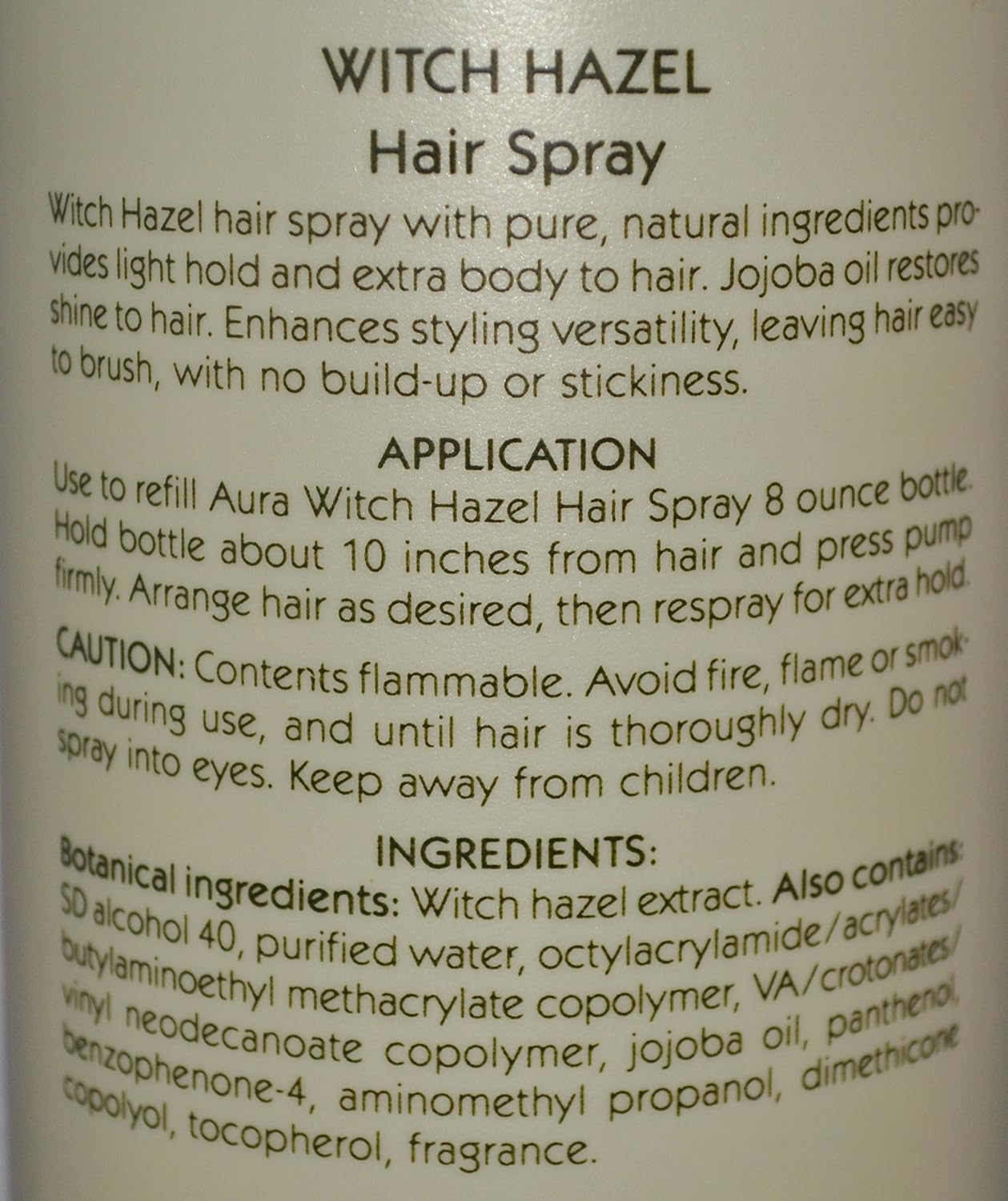 We do not conduct animal testing and never ask others to do so on our behalf. Skip to main content. The Jojoba oil adds shine without build up or weighing down hair. Shopwiki has thousands of results in Aurawitchhazelhairspraypump8ozb000143bk6 to choose from find the best now. This hair spray comes with pure natural ingredients which provide light hold and extra body. Light-hold non-aerosol hair spray reduces static and eliminates flyaways on fine and medium hair. In general as far as I know customers who bought Aura Firm Hold Hair Spray Witch Hazel by Naturelle 93 fl oz 275 ml or other products in the Internet also were interested in reviews cheap lowest prices in outlets and stores shipping gift ideas city deals sales coupons online new holiday daily deals bargain best buy products including special offers on Aura Firm Hold Hair. When applying witch hazel directly to your scalp you can do so using a dropper spray bottle or saturated cotton pad. Best Price Aura Firm Hold Hair Spray Witch Hazel by Naturelle 93 fl oz 275 ml Reviews Are you looking the best price for Aura Firm Hold Hair Spray Witch Hazel by Naturelle 93 fl oz 275 ml and you want to get great deals best buy this product.