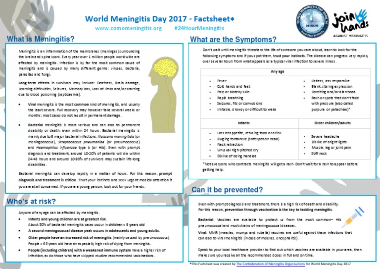 When the linings of the brain and spinal cord become inflamed it is called meningitis. The disease strikes quickly and can have. Early treatment is vital.